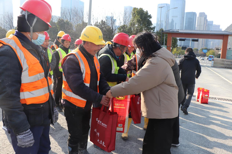 1月16日上午,南京銀行杭州蕭山支行黨員、團員們走進杭州錢江世紀城水云間時尚文化街區項目現場,走訪慰問春節留杭建筑工人,為他們送上“春節大禮包”以及新春祝福。