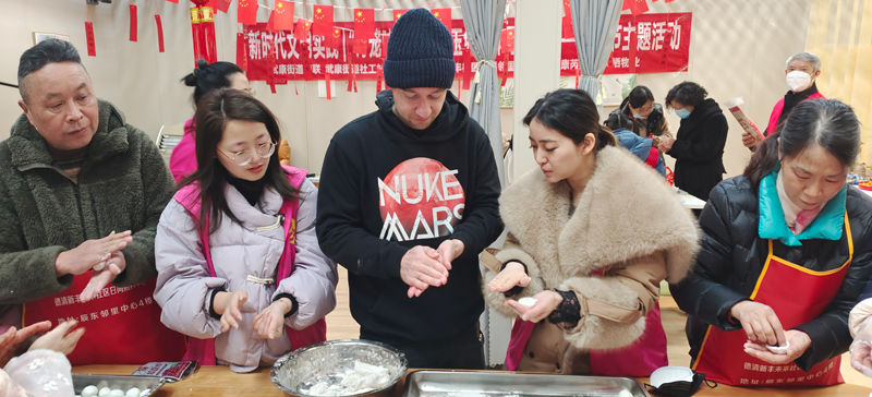 來自澳大利亞的外國友人與社區居民、青少年共同參與制作湯圓?!拔淇蛋⒔恪眰冮_始揉面、拌餡、搓湯圓,一邊嫻熟地做著豆沙餡的湯圓,一邊還手把手教外國友人?!疤腥ち?,中國傳統文化太有魅力了?!痹诘虑迥惩鈬Z學校工作的外教老師第一次體驗包湯圓。不一會兒,包好的湯圓逐漸擺滿桌面。