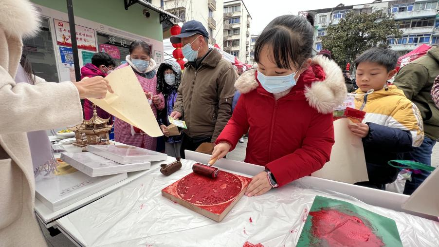 在年畫拓印傳統技藝攤位,市民在寓教于樂的氛圍中,了解木版年畫的歷史淵源、制作工藝與流程,并在技藝傳承人的指導下親手體驗了拓印的過程。體驗者不僅能擁有一副自己動手制作的年畫,還能了解春節民俗知識,感受傳統文化的魅力。