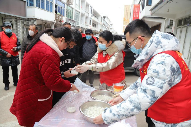 黨員志愿者向居民分發湯圓。峰江街道供圖