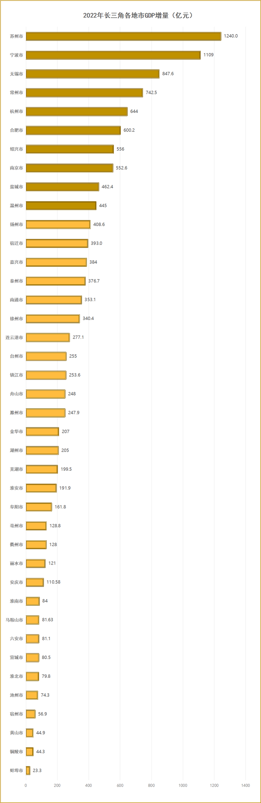 長三角各地市GDP增量排名中,蘇州市、寧波市、無錫市位列前三甲。2022年度,蘇州市實現GDP增量1240億元,寧波市實現GDP增量1109億元,無錫市實現GDP增量847.6億元。