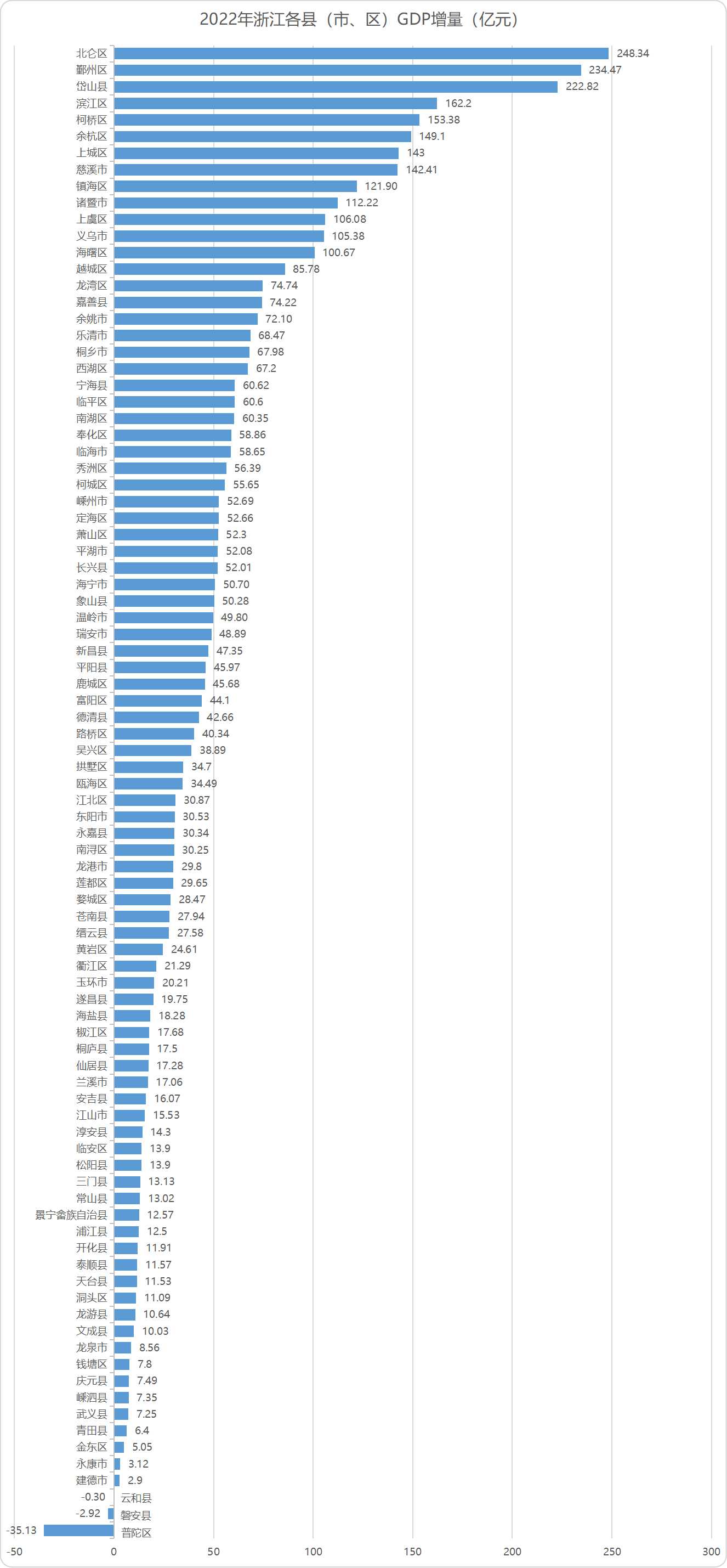 浙江省各縣(市、區)GDP增量排名中,寧波北侖區、寧波鄞州區、舟山岱山縣位居前三。2022年度,北侖區實現GDP增量248.34億元,鄞州區實現GDP增量234.47億元,岱山縣實現GDP增量222.82億元。