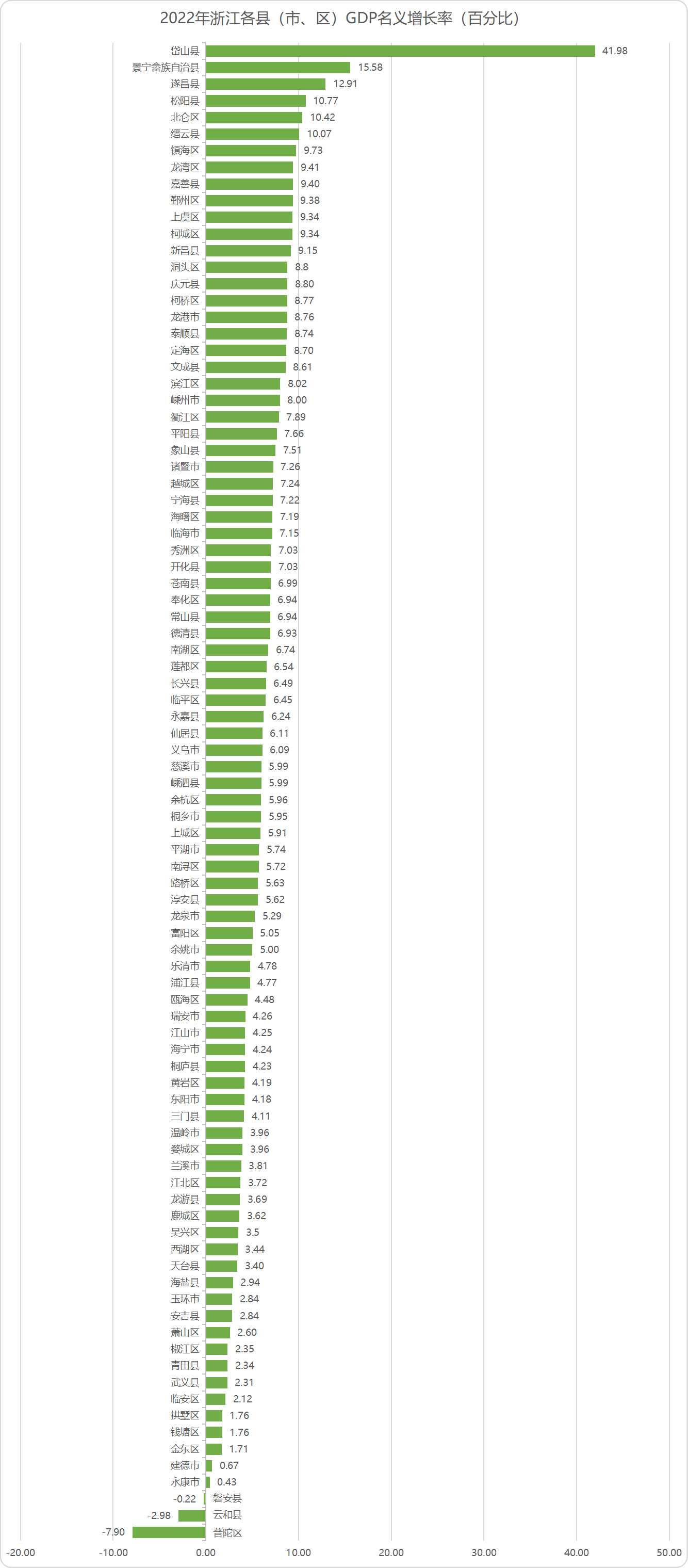 2022年浙江各縣(市、區)GDP名義增長率排行中,舟山岱山縣、麗水景寧縣、麗水遂昌縣位列前三。