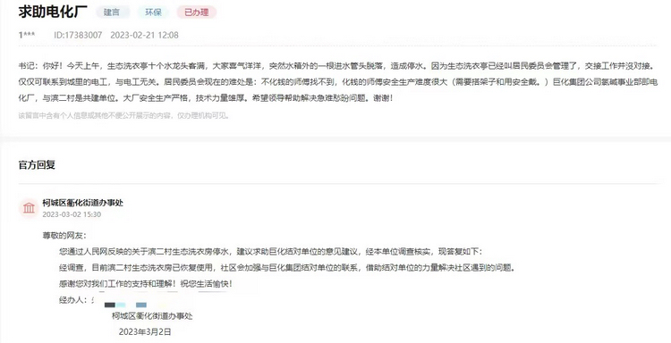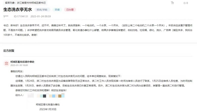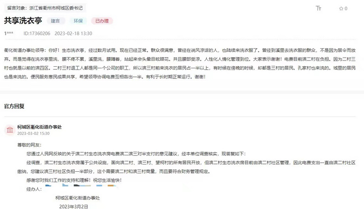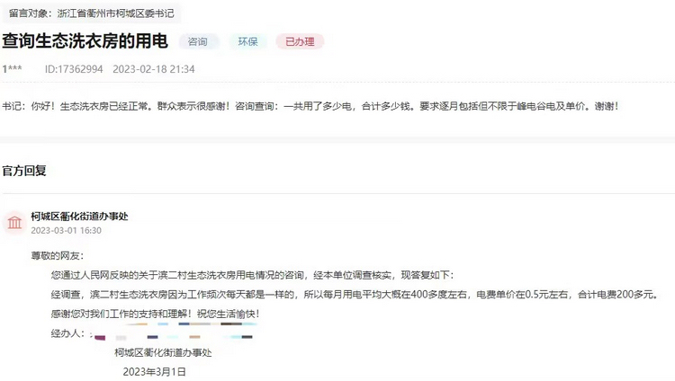 民生工作無小事,一枝一葉總關情。記者了解到,去年9月,作為“為民辦實事”項目,衢州柯城區濱二村開始建設生態洗衣亭,自招標至運行、管理,持續受到當地村民關注。今年以來,當地村民先后在人民網“領導留言板”發布4個留言詢問建設管理情況。從用電、用水到維修等,當地政府都一一予以解答。