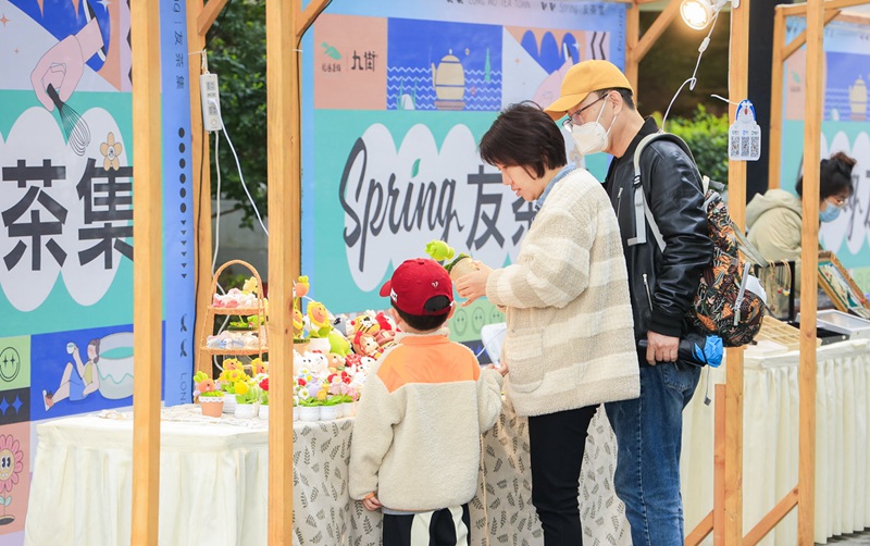走進九街主街區,春雨伴著茶香,沁人心脾。由80余家攤主共同打造的“Spring·友茶集”,為市民游客提供了一處以茶會友、放松休閑的飲茶聚集地。此外,在“Spring·友茶集”的天貓非遺館內,黃山毛峰、烏龍茶、普洱、祁門紅茶等非遺茶集聚,在逛市集的同時也能體驗到不同的茶文化韻味。