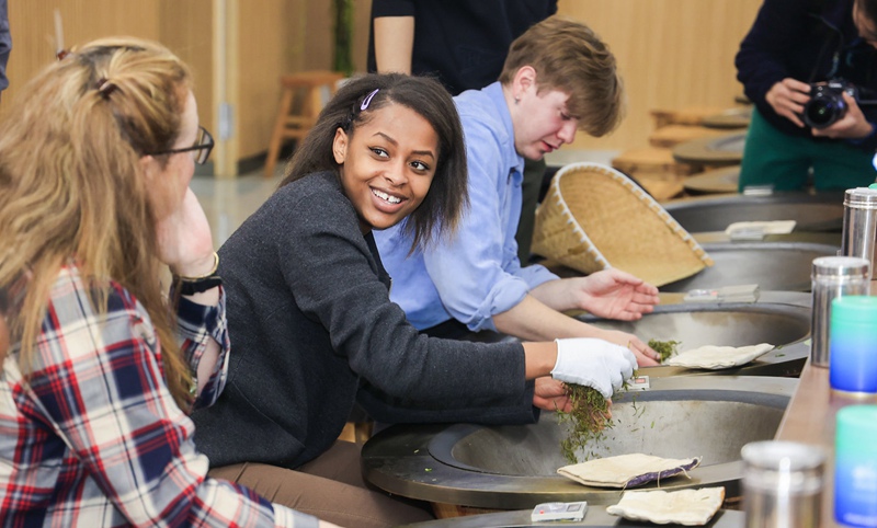 開茶節現場,在杭留學生體驗炒茶。西湖區文旅局供圖