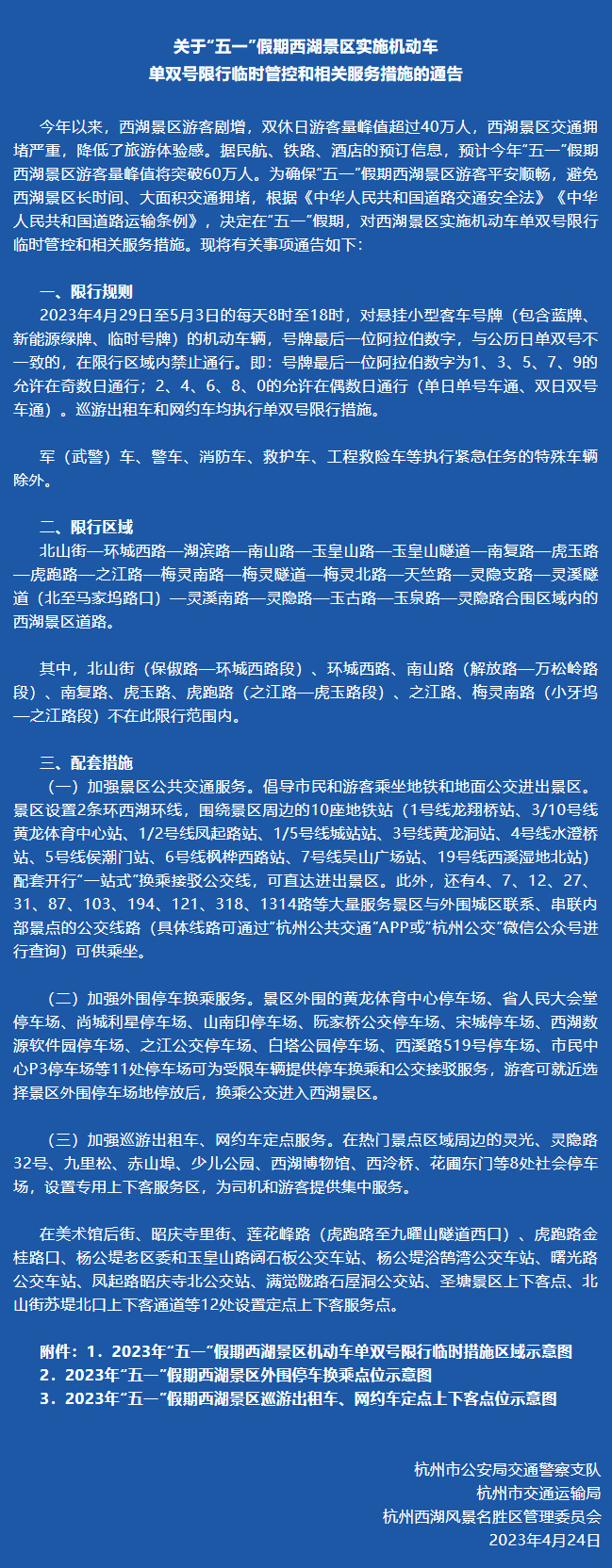 人民網杭州4月25日電 (葉賓得)昨天,杭州市公安局交警支隊、市交通運輸局、西湖景區管委會聯合發布通告,將在“五一”假期對西湖景區實施機動車單雙號限行臨時管控。