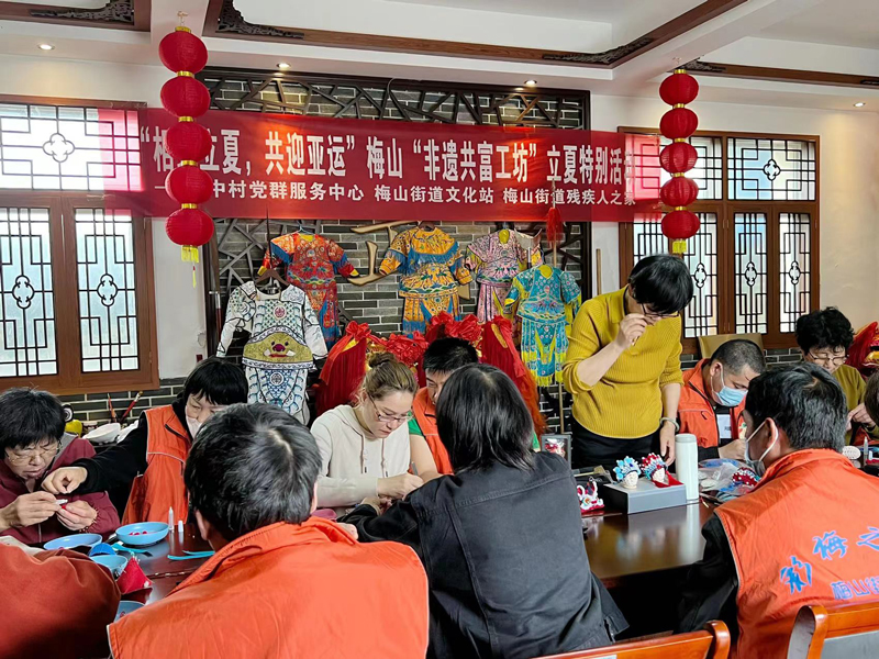此次活動由梅中村黨群服務中心聯合梅山街道文化站、殘疾人之家共同舉辦?!靶南嗉s 夢閃耀”是杭州亞殘運會主題口號。而此次的立夏特別活動也邀請了梅山殘疾人之家的10位托養人員。同時,考慮到手工針線活的安全問題,活動還邀請了梅中村婦女與托養人員一一結對,兩人一組協作進行活動。