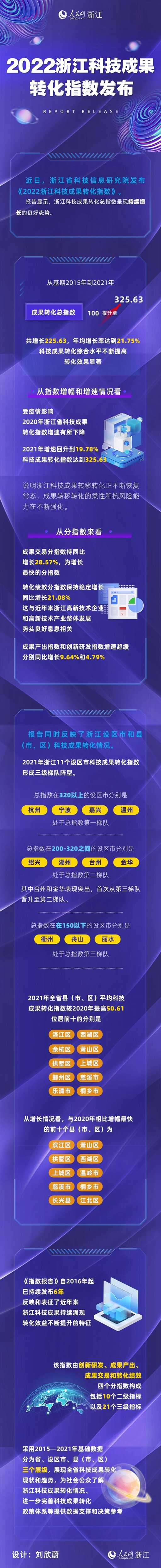 據了解,《指數報告》自2016年起,已持續發布6年,反映和表征了近年來浙江科技成果持續涌現,轉化效益不斷提升的特征。據了解,該指數由創新研發、成果產出、成果交易和轉化績效四個分指數構成,包括10個二級指標以及21個三級指標,采用2015年到2021年基礎數據,分為省、設區市、縣(市、區)三個層級,展現全省科技成果轉化現狀和趨勢,為社會公眾了解浙江科技成果轉化情況、進一步完善科技成果轉化政策體系等提供數據支撐和決策參考。