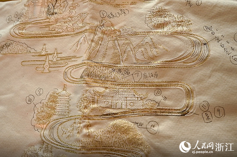 “在設計上,我們希望能體現大國禮服的風范與經典韻味的獨特?!眳呛Q嘟榻B,為了講好禮服的敘事性故事,展現浙江綠水青山的地域優勢和歷史文化特色,團隊在圖案上下足了功夫,“說到杭州,大家都會想到西湖,但如何將西湖十景表達在禮服上?我們團隊反復思考,最終想到用一根‘云水線’將西湖的柳浪聞鶯、雙峰插云、雷峰塔等景致串聯起來?!?/p>