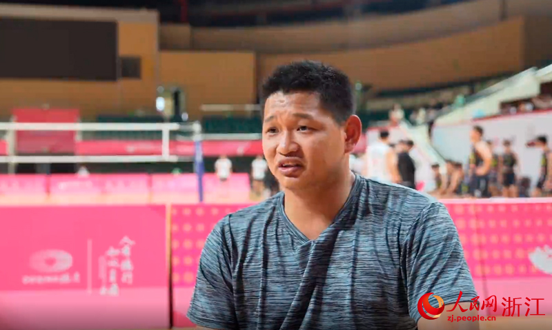 徐小兵在德清體育中心排球館接受采訪。人民網 陳陸洵攝