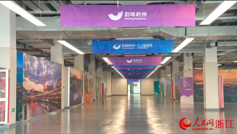 湖州德清地理信息小鎮三人制籃球場館內亞運標語隨處可見。人民網 陳陸洵攝