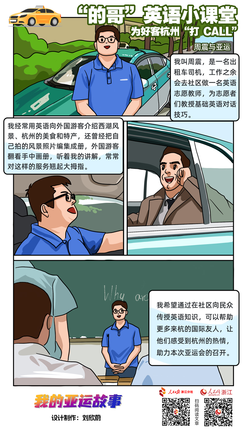 周震是一名普通的杭州出租車司機,但在不少外國人眼中,他是杭州最好的民間外交大使和導游。日常工作之余,他還有第三重身份——社區英語志愿教師。