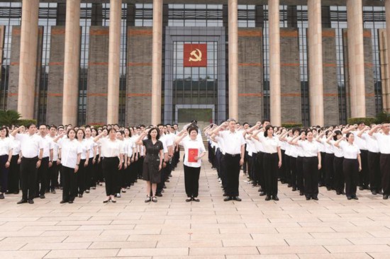 6月27日上午,來自省、市、縣三級機關的近千名黨員代表在嘉興南湖革命紀念館北廣場上重溫入黨誓詞。當天,黨員代表們來到南湖革命紀念館、南湖湖心島,參加“看一次展覽、聽一次黨課、學一次黨章、觀一次專題片、瞻仰一次紅船、重溫一次入黨誓詞”“六個一”紅船組織生活。(俞中岳)