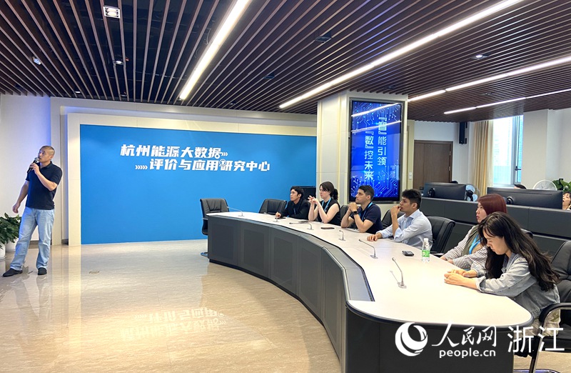 “你好,碳中和”主題調研團隊在杭州能源大數據評價與應用研究中心聆聽關于“杭州市能源雙碳數智平臺”的講解。人民網 方彭依夢攝