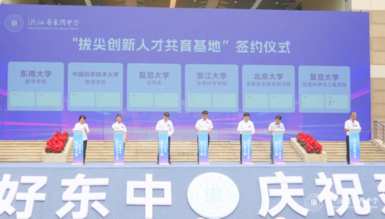 校慶當天,東陽中學與東南大學數學學院、中國科學技術大學物理學院、復旦大學化學系、浙江大學生命科學學院、北京大學信息技術高等研究院、復旦大學信息科學與工程學院等高校舉行“拔尖創新人才共育基地”簽約儀式。嚴濟慈校友紀念教育展館、量子科技實驗室也于當天在東陽中學揭幕落成,一臺九章光量子計算原型機模型捐贈給了東陽中學。