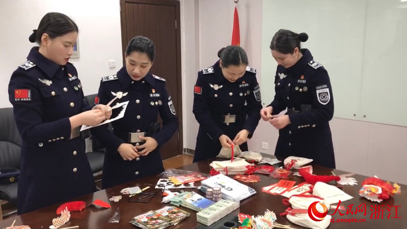 西湖女子巡邏隊隊員制作非遺手工剪紙“翻花龍”。人民網 秦銘澤攝
