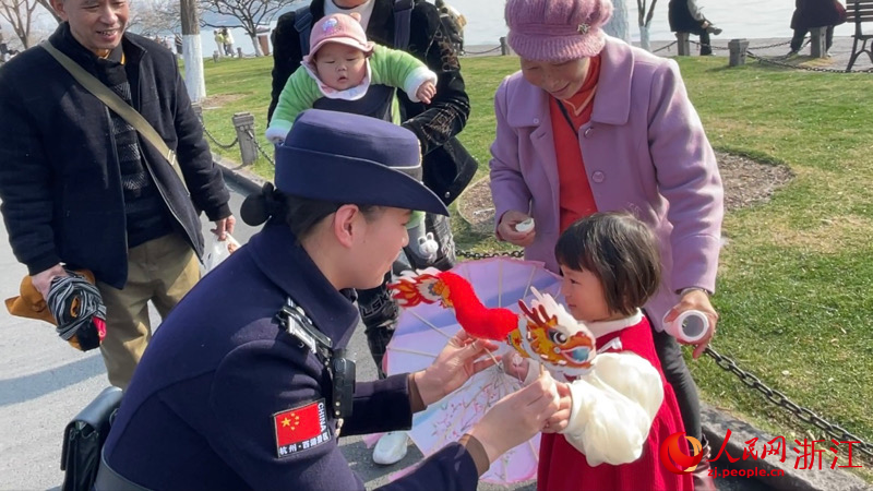 除此之外,西湖女子巡邏隊結合“大綜合一體化”行政執法改革,以“貼心服務+柔性管理”的工作法為載體,開展“非遺民俗辭舊歲 龍行龘龘迎新春”活動。在春節保障期間,西湖女子巡邏隊為市民游客提供咨詢服務與幫助、對不文明行為進行勸導、維護西湖景區面上管理秩序、配合處置突發事件,并提供《“小巡姐姐西游記”旅行服務手冊》、濕紙巾、果殼袋、暖寶寶等服務用品。同時,設置互動環節,抽取幸運游客贈送非遺手工剪紙舞龍和龍年文創貼紙,與市民分享美麗西湖的人文故事,送上新春祝福。