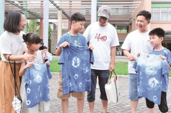 6月29日下午,嘉興市秀城實驗教育集團組織了一場傳統文化體驗活動,邀請家長代表和學生代表在老師的指導下,學習不同的扎結方法和染色技巧,將白色的T恤通過扎、染等工序,制作成了一件件個性獨特的扎染T恤。(趙穎碩)