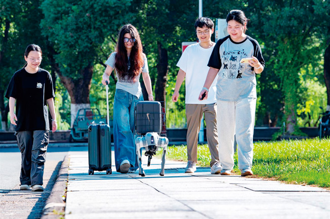9月8日,金華職業技術大學校園里,一位特殊“志愿者”——宇樹機器人變身“行李搬運工”,幫助學生搬運行李,吸引師生好奇的目光。