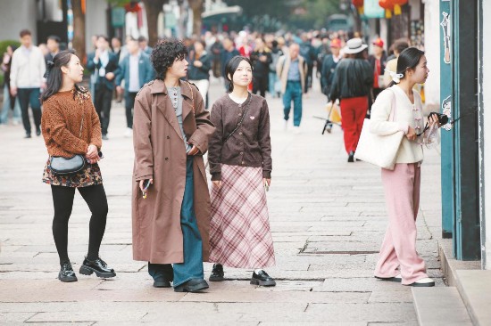 冷空氣持續影響紹興,10月21日,在魯迅故里、倉橋直街等地,往來市民與游客紛紛換上外套、薄毛衣,從容應對季節變化。(王駿)