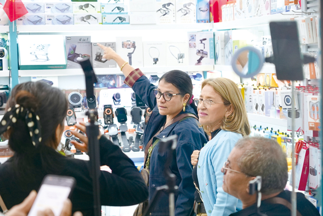 10月30日,在浙江義烏國際商貿城二區,幾名外國客商正在一家商鋪內挑選音響、耳機、智能手表等電子產品。